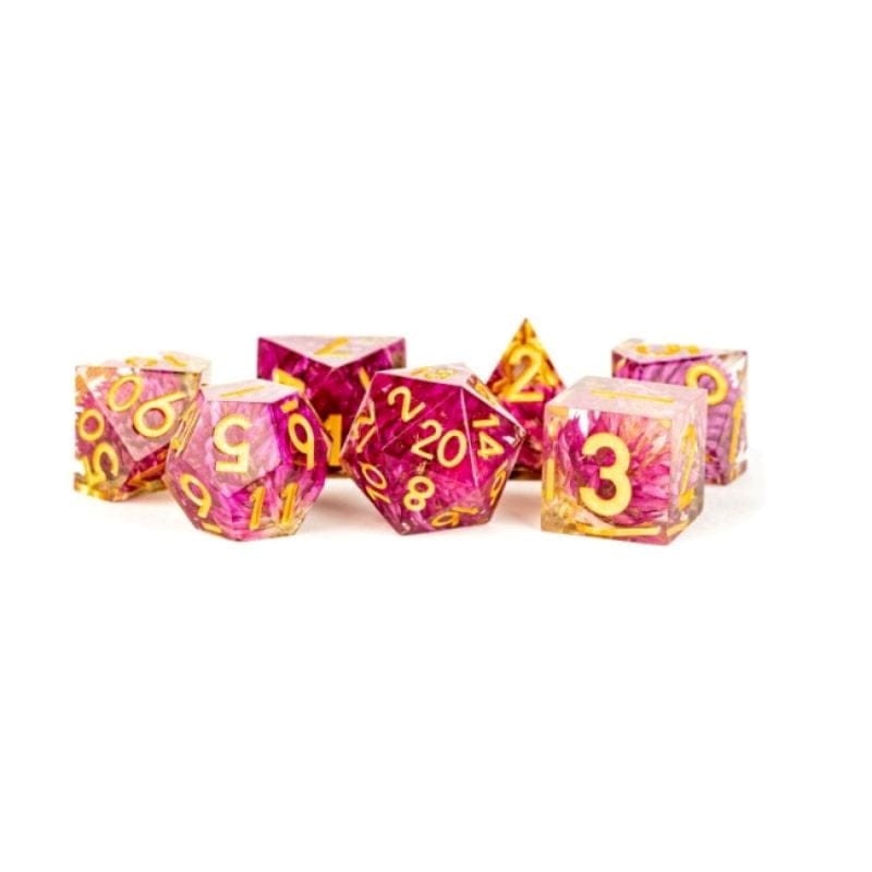 Our handcrafted, sharp edge resin dice are hand polished to keep their beautiful sharp edges. These dice are infused with beautiful real flowers. Because these dice are not tumbled, they are more precise than mass produced plastic dice. It's hard to beat the value in our resin dice sets. Beautiful and affordable, these are great "Critical Reinforcers" to our metal dice. Each 16mm polyhedral set comes with 7 dice (d4, d6, d8, d10, d10 (00-90), d12, and d20).