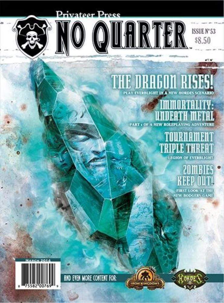 With an additional 16 pages of content, No Quarter #53 comes out with a vengeance! In addition to coverage of the latest WARMACHINE release, No Quarter offers a sneak preview of the new board game Zombies Keep Out, a host of new material for the Iron Kingdoms Full Metal Fantasy Roleplaying Game, more behind-the-scenes coverage of the upcoming WARMACHINE: Tactics video game, and much more, including additional new features and columns. No Quarter #53, due out in March 2014, has something for every player in the Iron Kingdoms . . . and beyond.