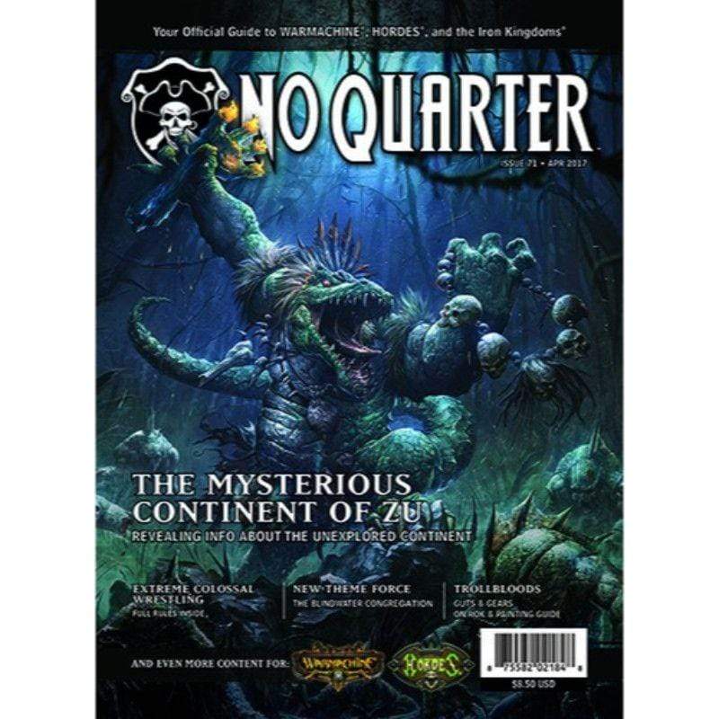 No Quarter #71 suplexes you off the top rope with a stable full of exciting content. Step into the ring with the newest No Quarter game, Extreme Colossal Wrestling! Journey to the mysterious continent of Zu in the latest installment of “Iron Kingdoms Uncharted.” It’s Mercs versus Minions in a battle report pitting the Rhulic Hammer Strike against the new Blindwater Congregation theme force. Our Tournament Triple Threat series continues with an in-depth look at Legion of Everblight. All this, plus a Gavyn Kyle File on Kryssa, Conviction of Everblight, a glimpse into the future of one of WARMACHINE’S iconic characters, and more! Know your army. Know your enemy. No Quarter.