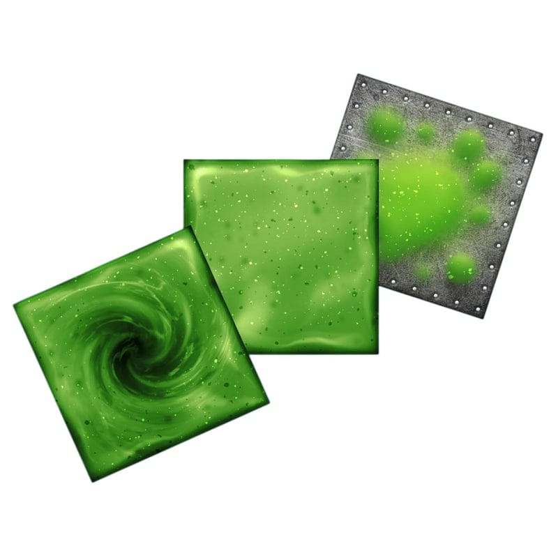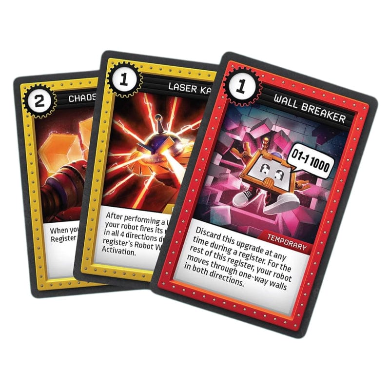 Robo Rally: Contamination consists of three double-sided game boards featuring new elements like radiation, radioactive waste, and one-way walls, along with five new upgrade cards.