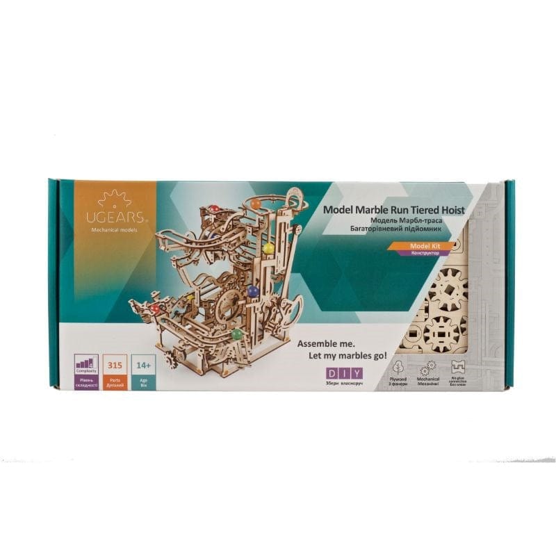 The model kit comes with everything you need right in the box. Individual pieces are laser pre-cut into high-quality wood composite boards and can be snapped together without the need of glue or special tools. It includes a set of detailed, illustrated instructions in 11 languages. There are 10 colored marbles included, plus sandpaper and wax to smooth and lubricate the gears and other moving parts. The Marble Run Tiered Hoist has 315 pieces, is rated "Advanced" level, and has an estimated assembly time of 5 hours. If you break a piece during construction, don't worry! Ugears customer service team will help with replacement parts, free of charge, as part of their commitment to outstanding customer service.