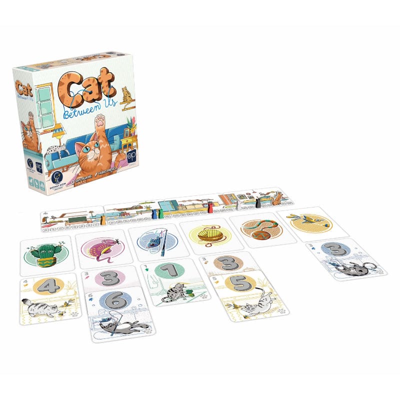 Each round in Cat Between Us, players first draw a card from the deck, then place the cat token on the numbered space on the track matching the tiny number on the card. Shuffle the deck, then deal all players their current hand size.