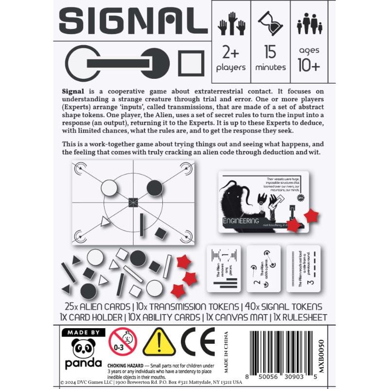 On a turn, the Experts arrange black and white pieces on a mat to represent a graphical signal, discussing and debating how and what to send. Once finished, the Alien then replies by using pre-set rules only they can see to add, remove, and adjust the signal, both to be helpful and to try and reach an agreement- represented by a pre-set signal that they are trying to achieve with their limited response capabilities. As the Experts analyze and understand the Alien, they can use limited guesses and a few hint-like abilities to discover what signal they can send that will result in agreement. The Alien even has a little leeway in how they respond- they want to be understood.
