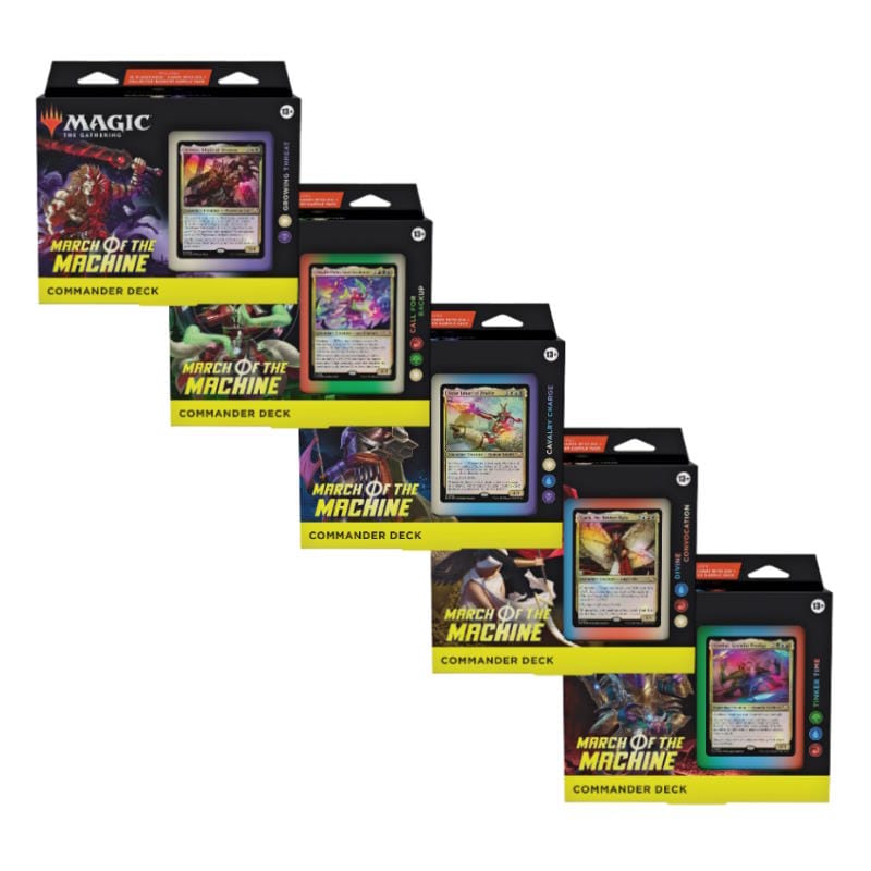 This March of the Machine Commander Deck set includes 1 ready-to-play deck of 100 Magic cards (2 Traditional Foil Legendary cards, 98 nonfoil cards), 10 specialty cards, a 2-card Collector Booster Sample Pack, 1 Foil-Etched Display Commander (a thick cardstock copy of the commander card with foil etched into the card’s border and art), 10 double-sided tokens, 1 deck box (can hold 100 sleeved cards), 1 Life Wheel, 1 special die, 1 strategy insert, and 1 reference card.