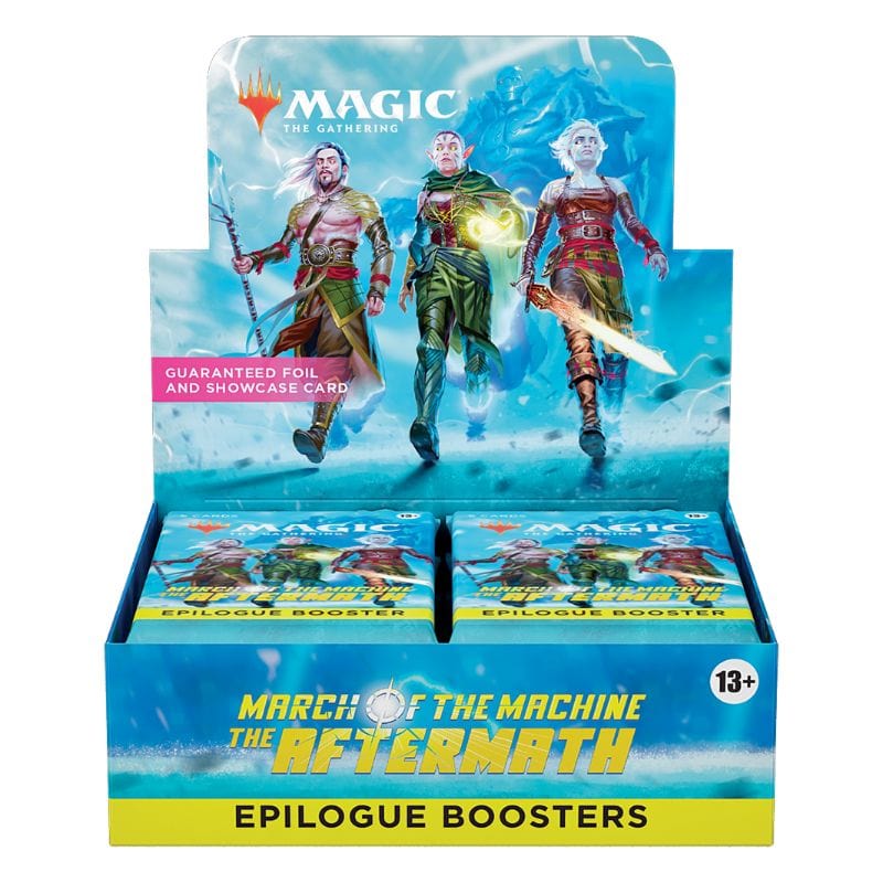 The March of the Machine: The Aftermath Epilogue Booster Box contains 24 March of the Machine: The Aftermath Epilogue Boosters. Each Epilogue Booster contains 5 cards, with a combination of 1–3 card(s) of rarity Rare or higher and 2-4 Uncommon cards. In every pack, a total of 1–2 card(s) of any rarity are Traditional Foil.