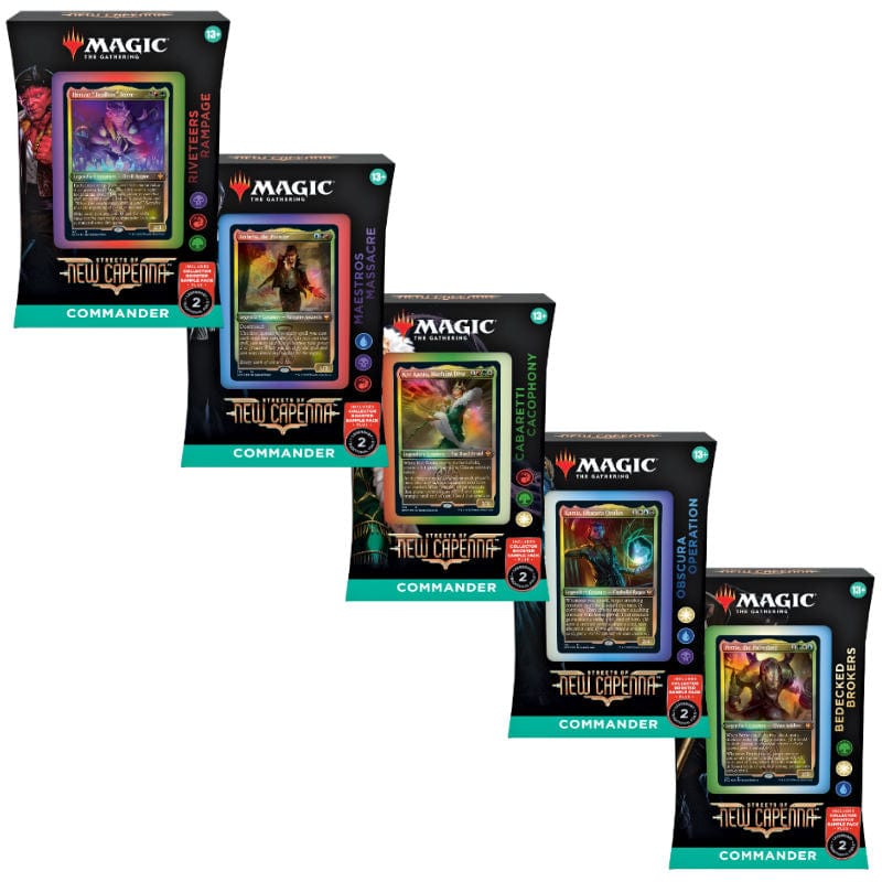 The Streets of New Capenna Commander Deck - Includes 1 ready-to-play deck of 100 Magic cards (2 traditional foil, 98 nonfoil), a 2-card Collector Booster Sample Pack, 1 foil-etched Display Commander (a thick cardstock copy of the commander card with foil etched into the card’s border and art), 10 double-sided tokens, 1 counter punchout card, 1 deck box (can hold 100 sleeved cards), 1 life tracker, and 1 reference card.