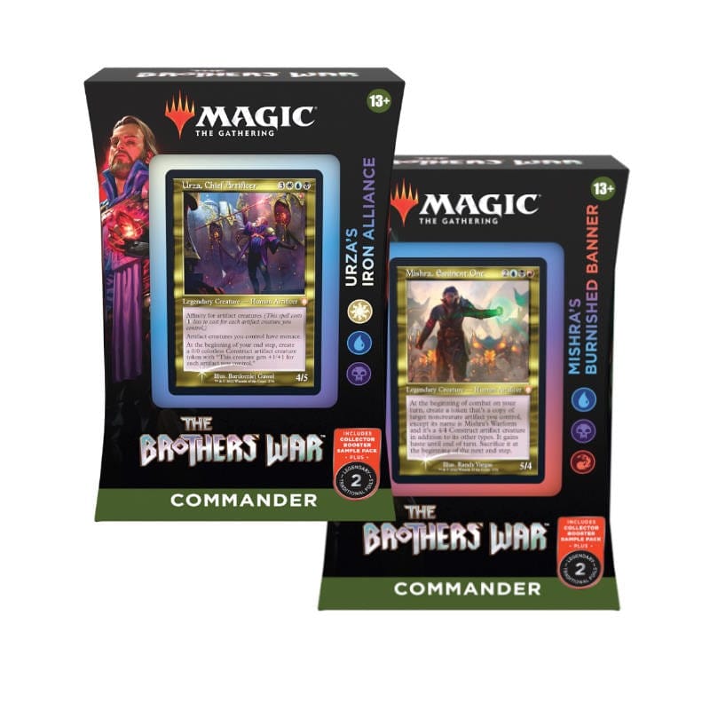 The Brothers' War Commander Deck includes 1 ready-to-play decks of 100 Magic cards (2 traditional foil legendary cards, 98 nonfoil cards), a 2-card Collector Booster Sample Pack, 1 foil-etched Display Commander (a thick cardstock copy of the commander card with foil etched into the card's border and art), 10 double-sided tokens, 1 deck box (can hold 100 sleeved cards), 1 Life Wheel, 1 strategy insert, and 1 reference card.