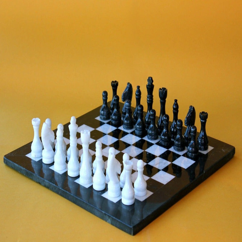 Chess Set - Marble 12" board with black/white pieces and velvet-lined storage case.