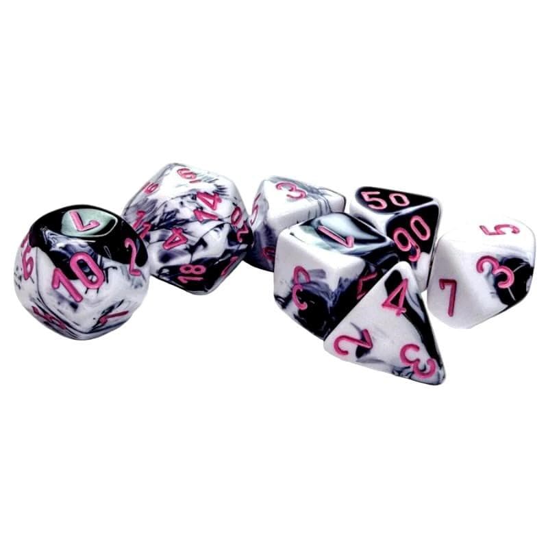 For use in tabletop RPG games (such as Dungeons & Dragons). This set contains 7 Gemini Black-White dice with pink numbers with the following shapes: 1 x 4-sided die (PG0469) 1 x 6-sided die (PG0669) 1 x 8-sided die (PG0869) 1 x 10-sided die (PG1069) 1 x tens 10-sided die (PG1169) 1 x 12-sided die (PG1269) 1 x 20-sided die (PG2069) These are held in an 02805 Display Case with Lid.
