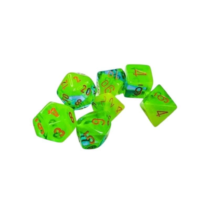 Bring cosmic energy to your tabletop adventures with the Gemini® Plasma Green-Teal dice set! Featuring a vibrant blend of green and teal with striking orange numbers, these dice are perfect for RPGs like Dungeons & Dragons and Pathfinder.