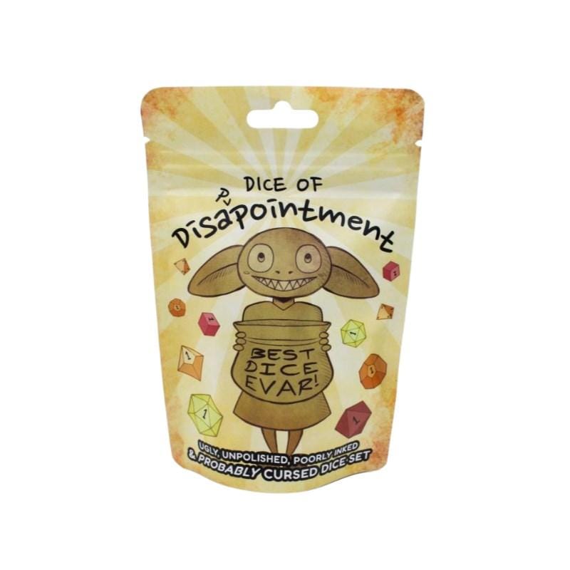 A set of 7 novelty polyhedral TTRPG dice, made mostly of Acrylic or Resin, each bag contains a mismatched set.