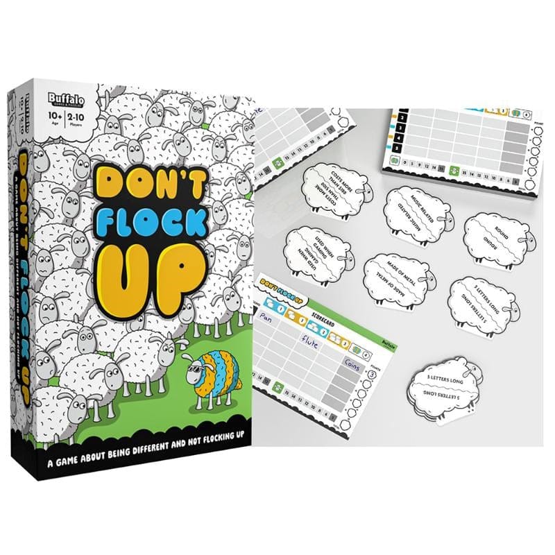 Don't Flock Up - a game about being different and not flocking up! Can you be unique or are you just part of the flock? In this family party game, players race to create the single connections between the most of 6 category cards. If you can create the most unique answer, you will score bonus points but if your answer matches another player's, you both flocked up and will lose points.