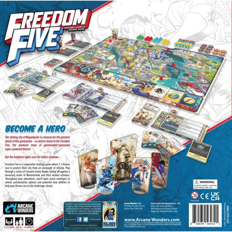 Freedom Five: A Sentinel Comics Board Game is a co-operative strategy game in which 1- 5 heroes race to protect their home city and its inhabitants from an onslaught of villainy from Baron Blade and his criminal cohorts. Each player must master their character's unique abilities to manage multiple crises throughout the city of Megalopolis. Assemble your friends to face standalone challenges, or mix it up and adventure through a series of campaign comics in which you will gain rewards and new threats each session.