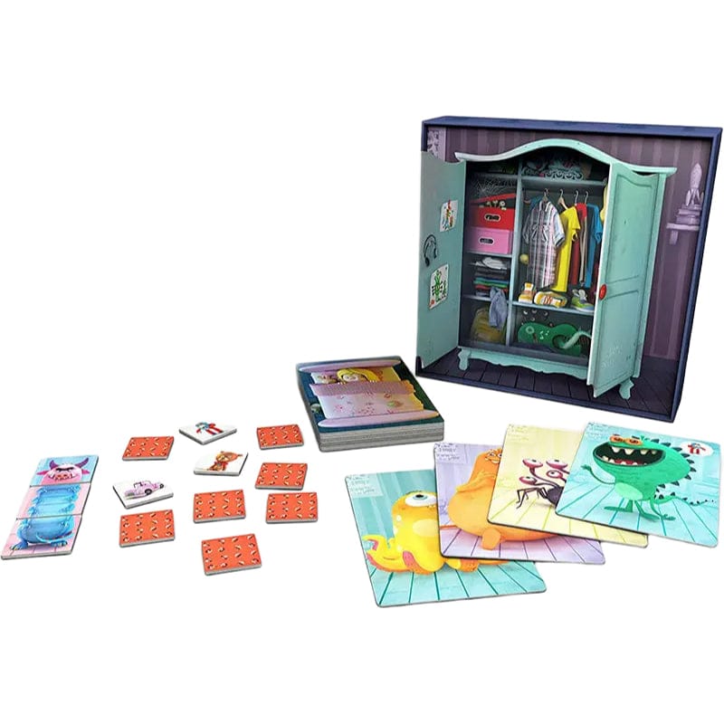 In game terms, face down cards are placed on the table with tiles placed around these cards. To start, a card is revealed that depicts a monster and the toy it is afraid of. In turn order, each player must now find the toy that scares off this monster, with the toy being hidden in the face down tiles. If players make three mistakes while searching, a new monster appears with a different toy needed to scare it away. Once all the monsters are out, players have only three chances to get rid of them all.