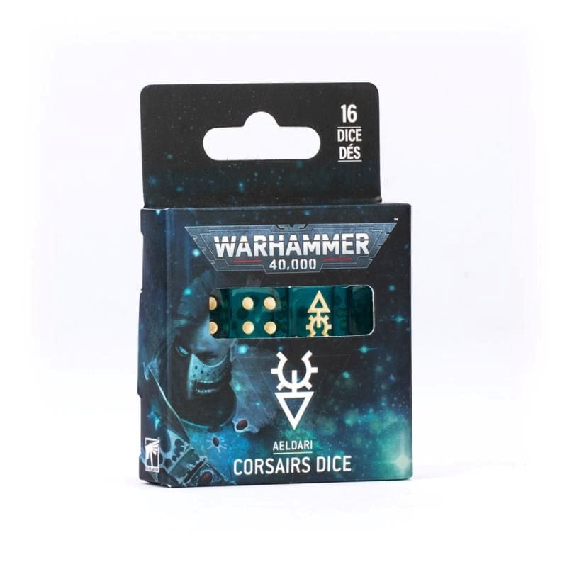 This is a set of 16 six-sided dice with squared edges, themed around the Aeldari Corsairs. They are cast in teal gem-effect acrylic plastic with cream ink markings, and measure 16mm along each edge. Each '6' face is decorated with the icon of the Aeldari Corsairs.